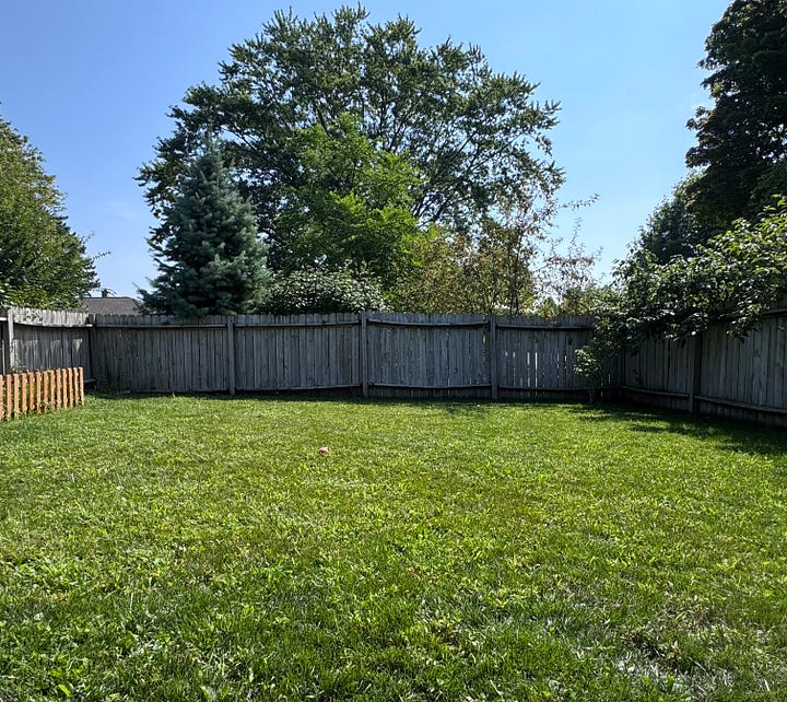 Grass. Lush and green, a square carpet or a swaying sea. Blades curl beneath my feet, catch the heat of the sun, support my body as I lay down and look up at the sky, marvel at the making of a yard.